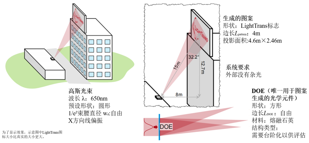 衍射光束擴(kuò)散器可以設(shè)計(jì)成任何圖案。本示例中我們展示了VirtualLab Fusion設(shè)計(jì)、優(yōu)化、建模和模擬這種衍射光學(xué)元件(DOE)和整個(gè)系統(tǒng)的一些可能性,將LightTrans公司的標(biāo)志投射到建筑物的高層上。有不同的方法來生成光的圖案。本示例展示了使用相干激光和衍射光束擴(kuò)散器實(shí)現(xiàn)良好的效率分布和有趣的映射圖案。