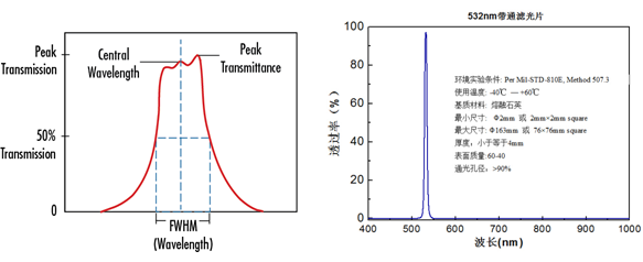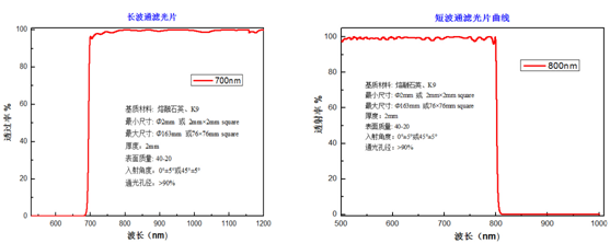 濾光片制備上我們以熔融石英、K9玻璃為基底,表面質(zhì)量可做到60-40 ,在保障平均透射率大于90%的前提下,截止深度可大于OD4,其測(cè)試的典型曲線如圖2所示,其他波長(zhǎng)、材料、尺寸及特性要求可以按照客戶需求定制。