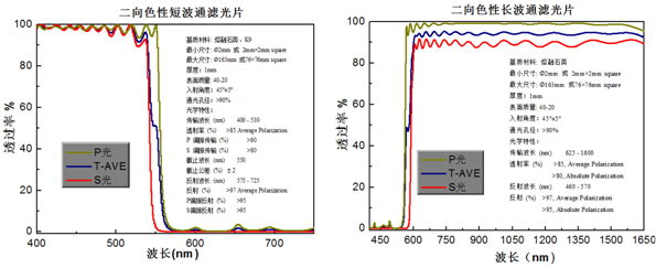如圖5.b所示,基底材料為熔融石英,二向色性長(zhǎng)波通濾光片的入射角為45°,截止的光線將在90°的角度被反射回去,透射率在625-1600nm范圍內(nèi)平均偏振大于>85%;反射率在460-570nm平均偏振大于97%。其他波長(zhǎng)、材料、尺寸及特性要求可以按照客戶需求定制。這一特性使濾光片非常適用于熒光應(yīng)用或用作光譜分光鏡,偏振相關(guān)損耗小、光譜范圍大,且由精密熔融石英基片制作而成,且任何尺寸可根據(jù)客戶需求定制。