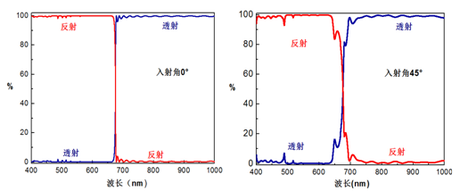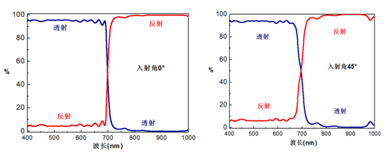 圖6. 以0°和45°入射的高性能冷反射鏡多層介電膜典型曲線圖