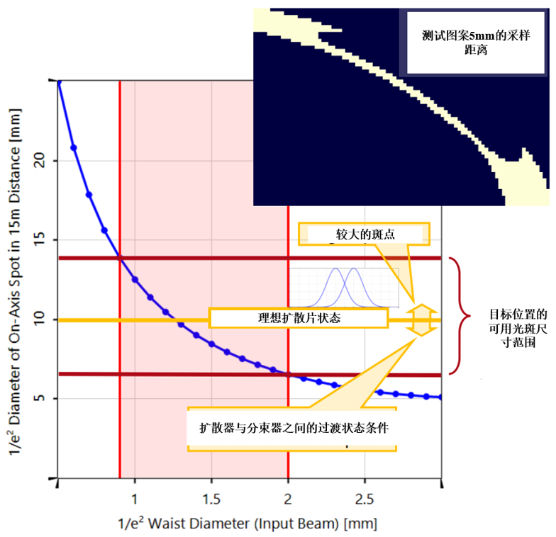 擴(kuò)散器元件以創(chuàng)建所需圖案的方式偏轉(zhuǎn)入射光束。分辨率由單個(gè)光束點(diǎn)的大小決定。通過(guò)一個(gè)簡(jiǎn)單的光學(xué)設(shè)置,我們確定可實(shí)現(xiàn)的光斑直徑為≥5毫米。