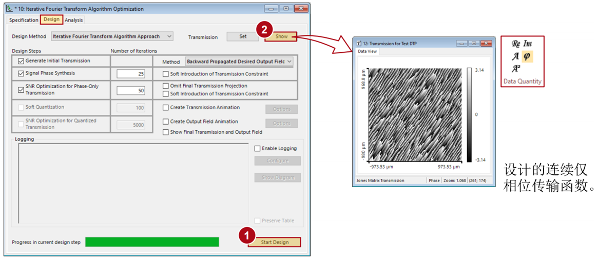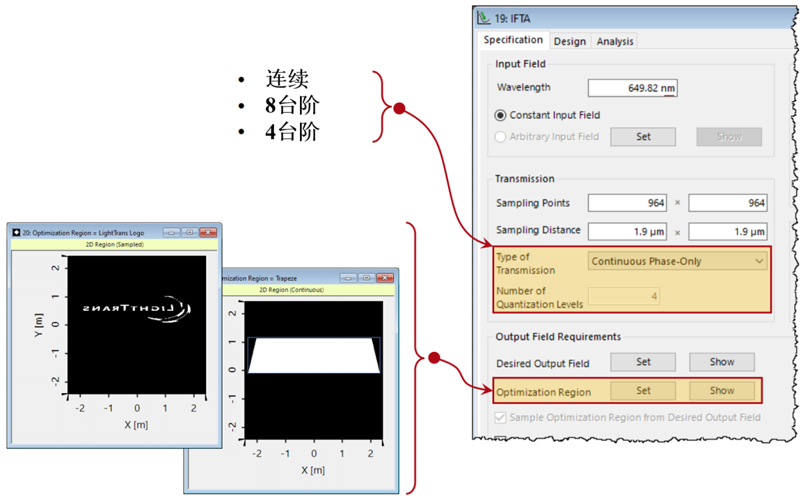 用于設(shè)計(jì)的迭代傅里葉變換算法(IFTA)用于在準(zhǔn)直光照明的透射函數(shù)平面與k域偏轉(zhuǎn)光方向的相關(guān)目標(biāo)值之間進(jìn)行優(yōu)化。