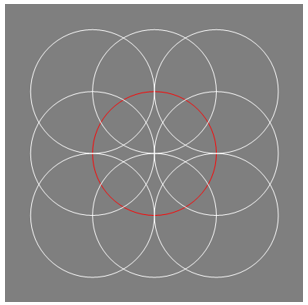 實(shí)際產(chǎn)生的強(qiáng)度紋理由理論最小值和最大值之間的值表示,這是由所有涉及的重疊光束的理想的相消和理想的相長(zhǎng)干涉(具有隨機(jī)相位值)造成的;疑膱D顯示了一個(gè)(紅色的)目標(biāo)點(diǎn)與其相鄰點(diǎn)的重疊。