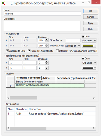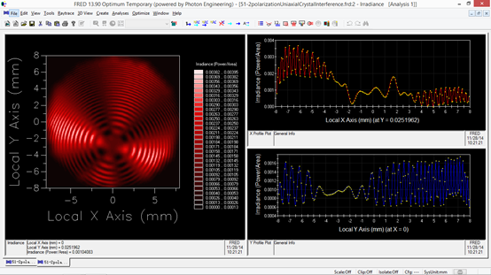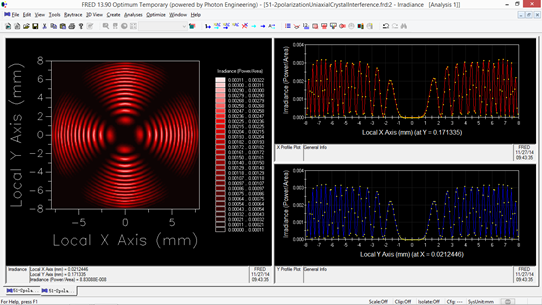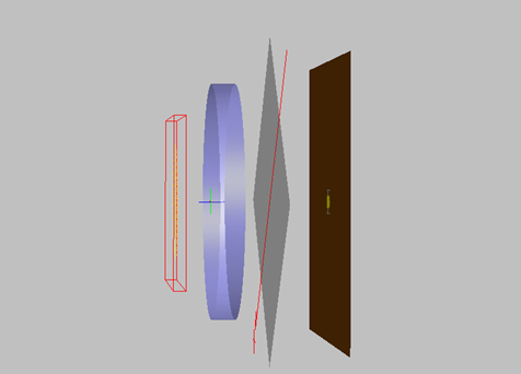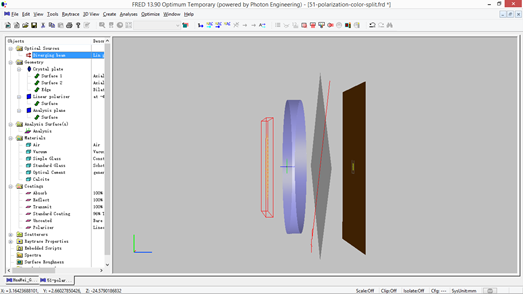 偏振光干涉現(xiàn)象在實(shí)際中有很多應(yīng)用,這里要模擬的是一種典型的雙折射干涉實(shí)驗(yàn),設(shè)置如下圖所示:左側(cè)是偏振光源,偏振方向是在xy平面且與x軸夾角45度,所有光線的反向延長(zhǎng)線指向一點(diǎn)。接下來(lái)光線經(jīng)過(guò)方解石平板,厚2mm,光軸方向沿z 軸。然后光線通過(guò)偏振片,偏振片方向與光源方向垂直(xy 平面,與x 夾角-45度),偏振片是通過(guò)設(shè)置偏振鍍膜來(lái)實(shí)現(xiàn)的。最右邊是接收分析面,光線在這里停止,用來(lái)計(jì)算光強(qiáng)。