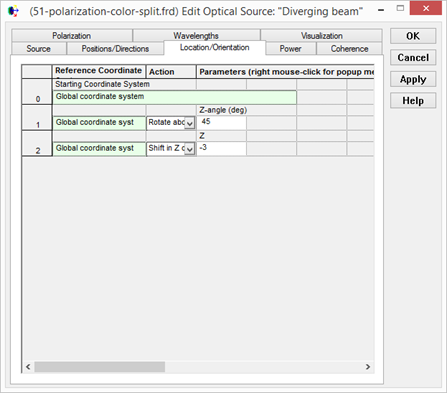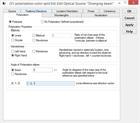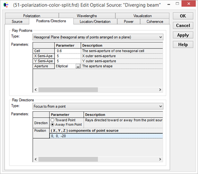 右擊光源文件夾并選擇新建詳細(xì)光源。命名為Diverging beam,光源的類(lèi)型選擇為六邊形平面,方向選擇從某點(diǎn)發(fā)出,并且把這一點(diǎn)選在z軸負(fù)軸的某一點(diǎn)(0,0,-20)。設(shè)置光源設(shè)為相干光,在偏振(polarization)選項(xiàng)卡里設(shè)置光源偏振類(lèi)型和方向?yàn)榫性偏振,方向?yàn)閤軸方向(下面通過(guò)把光源沿z軸選擇-45度來(lái)調(diào)整偏振方向,當(dāng)然也可以在這里設(shè)置偏振方向?yàn)槟骋粋(gè)特定點(diǎn)方向,但是用前一種方法在需要改變光源偏振方向時(shí)會(huì)更方便一些)。然后設(shè)置光源位置和旋轉(zhuǎn),將光源位置設(shè)置在(0,0,-3),沿z軸選擇-45度。