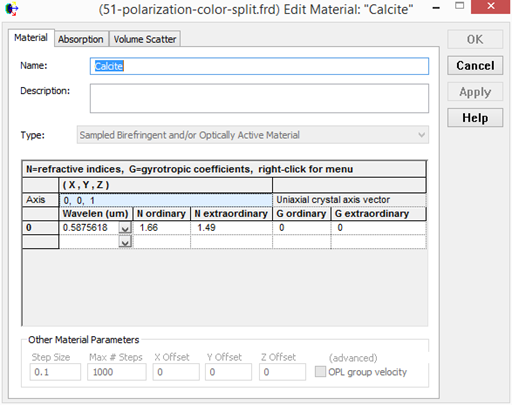 下面設(shè)置雙折射材料。在材料文件夾下右擊,選擇新建材料(create a new material),選擇類(lèi)型為取樣雙折射材料或旋光性物質(zhì)(sampled birefringent and/or optically active material),波長(zhǎng)設(shè)置為0.5875618,o光和e光的折射率分別設(shè)為1.66 和 1.49,光軸方向設(shè)置為z軸(0,0,1)。
