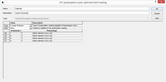 偏振片是通過(guò)偏振鍍膜來(lái)實(shí)現(xiàn)的,如下新建偏振鍍膜。右擊鍍膜文件夾,新建鍍膜,類(lèi)型選擇偏振/波片鍍膜瓊斯矩陣(Polarizer/Waveplate Coating jones matrix),然后默認(rèn)的就是沿x軸偏振鍍膜。