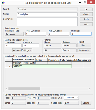 在幾何結(jié)構(gòu)文件夾(geomertry)下右擊,選擇新建透鏡(lens)。如下如設(shè)置半徑10,厚度2,雙面曲率為0,在原點(diǎn)處,并且把方解石材料的套用在該透鏡上。如下圖所示。