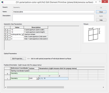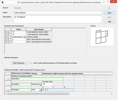 在幾何結(jié)構(gòu)文件夾下(geometry)下右擊,新建基本元件(create element primitive),平面(plane),半長(zhǎng)寬分別是10單位,旋轉(zhuǎn) -45度,向z軸負(fù)方向平移5個(gè)單位。把偏振鍍膜套用在偏振片上。