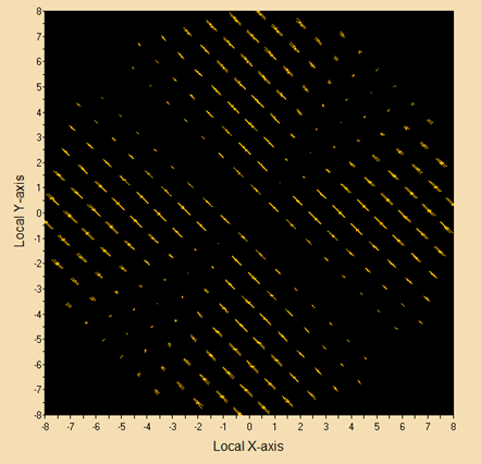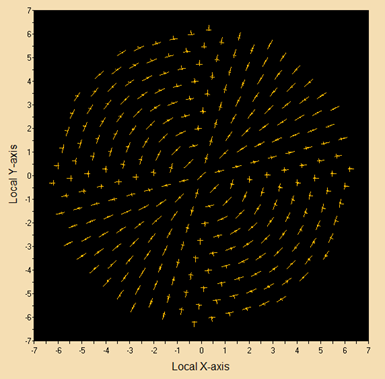 在 Analysis/Polarization Spot Diagram (Ctrl+Shift+L) 里查看分析面上的光線偏振情況,應(yīng)該都是方向?yàn)?45度的線偏光,如下圖所示。也可以將接收面移動(dòng)到偏振片之前,將接受面沿z軸的偏移量從10 單位長(zhǎng)度調(diào)整到3,查看一下這里光線的偏振情況?梢钥吹給光和e光在同一傾斜角,不同方位角時(shí)分量會(huì)不同。
