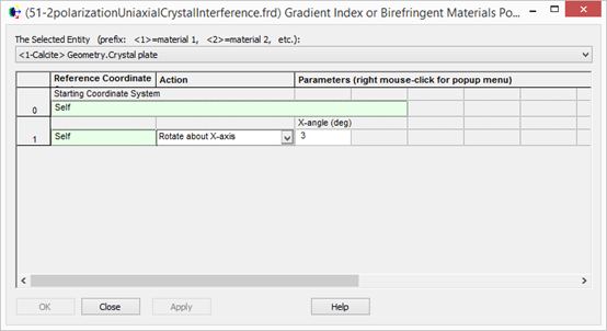 晶體的光軸或者漸變折射率材料(GRIN)的方向可以在 Tools -> edit/view GRIN/Birefrigent Material position/orientation (查看調(diào)整漸變折射率材料/雙折射材料位置方向)中調(diào)整,分別選者材料和元件,調(diào)整位置或角度,如下圖所示。