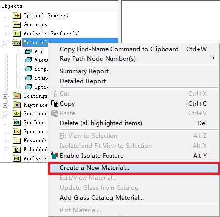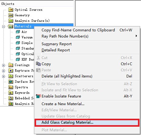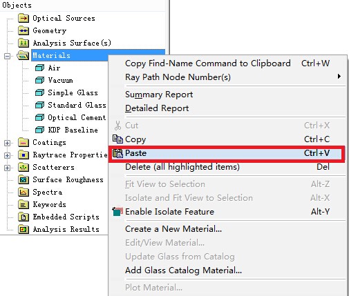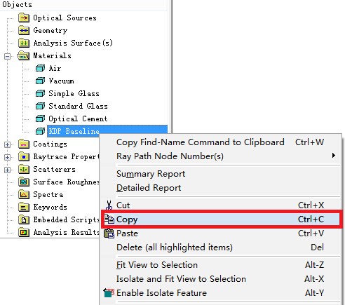 步驟2:復(fù)制KDP BaseLine到Materials樹形文件夾下,具體操作為鼠標(biāo)左鍵選中KDPBaseline,右鍵選擇Copy,并在Materilas 下選擇paste,并命名為KDP。