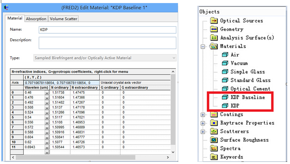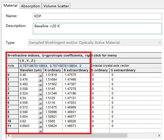 步驟1:創(chuàng)建雙折射材料KDP(磷酸二氫鉀晶體),命名為KDP Baseline。在樹形文件夾中選擇Materials>Create a New Material>Sampled Birefringent and/or Optically Active Material,按照如圖所示的數(shù)據(jù)輸入如下數(shù)值(KDP材料的創(chuàng)建方法請見本文后的備注)。