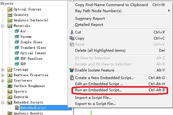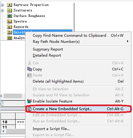 步驟3:創(chuàng)建一個折射率隨溫度變化20k后的折射率變化模型,我們利用FRED軟件自帶的VB腳本實現(xiàn)此功能。在樹形文件夾選擇Embedded Scripts,右鍵選擇Create a New Embedded Scrips,注意刪除腳本編輯器里面的所有內(nèi)容,然后粘貼如下的程序到此編輯器中。