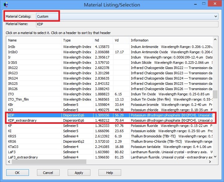 KDP材料可在材料庫中找到,在樹形文件夾Materials/ Add Glass Catalog Material… ,在類型中選擇Custom,點(diǎn)中鼠標(biāo)上下鍵移動找到KDP(排列方式是按照第一個英文字母a-z排序)。