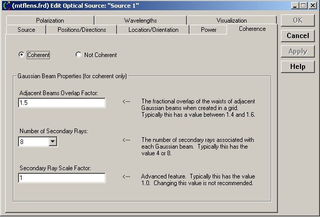 這篇文章中我們所使用的系統(tǒng)是一個簡單的透鏡,將光聚集到附著在幾何面的分析面上。透鏡是一個簡單的雙凸BK7單透鏡,參數(shù)為r1=60 mm, r2=-300 mm, ct=4 mm, x semi-aperture=10, y semi-aperture=10,該透鏡的像平面位于近軸焦點處。