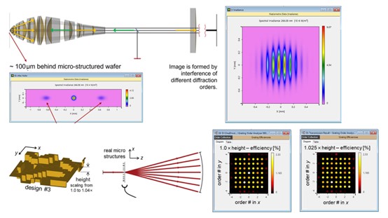 從模擬的角度來看,這種組合可能具有挑戰(zhàn)性:衍射光柵,特別是那些具有較小特征尺寸的衍射光柵,需要一種嚴(yán)格的方法來求解麥克斯韋方程 — 一個特別適合的選擇是傅里葉模態(tài)方法或者嚴(yán)格耦合波分析(FMM/RCWA),因為它是一種基于問題的周期性假設(shè)的求解器。然而,當(dāng)涉及到透鏡和其他宏觀元件時,這些方法都是多余的:FMM嚴(yán)格的采樣要求使得用這種算法來模擬一個典型的宏觀透鏡是不切實際的。
