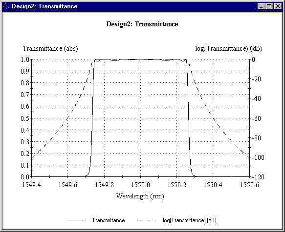 顯示候選設(shè)計(jì)結(jié)果的特性,并按用戶指定的方式進(jìn)行排列,如總的膜層厚度, 沉積時(shí)間和脈動(dòng)性能。通過脈動(dòng)優(yōu)化算法,增加只是由1/4波長厚度的膜層組成的結(jié)構(gòu),減少通帶中的脈動(dòng),使DWDM助手中使用的對稱周期技術(shù)功能增強(qiáng)。一般來說,對給定要求的濾波器,有許多的設(shè)計(jì)都滿足要求,但DWDM 助手可以按評價(jià)標(biāo)準(zhǔn)對設(shè)計(jì)結(jié)果進(jìn)行排列。