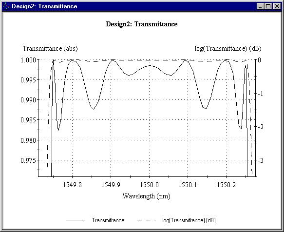 上圖顯示的是用DWDM助手、加上二層非-1/4波長匹配結(jié)構(gòu)產(chǎn)生的濾波器設(shè)計(jì)的特性曲線。下圖顯示的是通帶部分的放大圖。