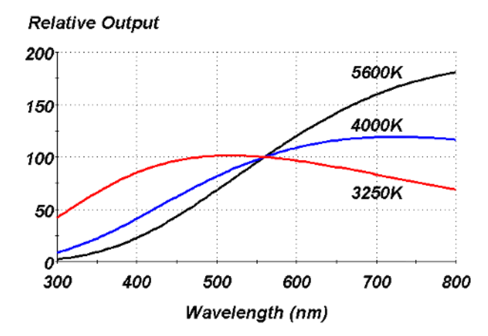 圖1.幾種不同黑體光源的相對(duì)輸出。與正常情況一樣,曲線在560納米處被標(biāo)準(zhǔn)化為100。