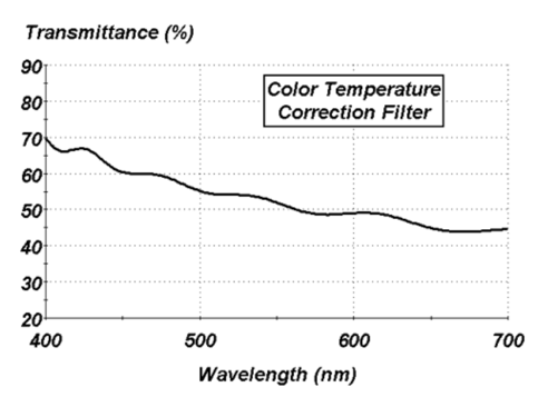圖4.彩色校正濾光片的透射比,設(shè)計(jì)用于將3000K黑體特性轉(zhuǎn)換為3300K。這相當(dāng)于在RCCT(Reciprocal Correlated Color Temperature)下-30rmk(Reciprocal Megakelvin)的變化。