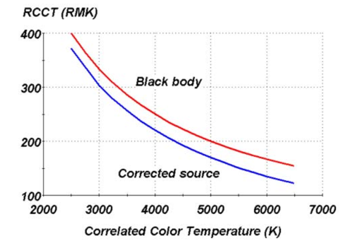 圖5.一系列黑體光源在有色溫校正濾光片和無(wú)色溫校正濾光片的情況。幾乎恒定在-30rmk
