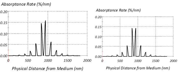 圖1顯示了使用具有無吸收低折射率材料(SiO2)和輕微吸收的高折射率材料(TiO2)薄膜的窄帶濾光片的一些結(jié)果。電場分布的平方很好地解釋了吸收率變化。勢吸收率幾乎相同,因為反射率為零,但膜層前面部分的吸收降低了墳?zāi)股系腎enter的值,因此膜層后部的吸收率逐漸增加。
