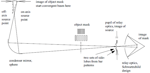 本例介紹了如何上述第二種方法來(lái)實(shí)現(xiàn)部分相干光的建模。如圖1所示,整體結(jié)構(gòu)是一個(gè)科勒照明系統(tǒng)。一個(gè)聚光元件將非相干光源傳遞到轉(zhuǎn)像透鏡的入瞳處。非相干光源照亮物體掩膜面,并在最后的像面上得到適當(dāng)放大的像。為了對(duì)光束合理采樣,光源放在物體掩膜的共軛面處,以便光源具有一定的尺寸,而不是理想點(diǎn)光源。對(duì)于具有一定尺寸的光源,它所成的像就是部分相干的。當(dāng)光源大到可以填滿轉(zhuǎn)像透鏡入瞳時(shí),其所成的像就將是非相干的。
