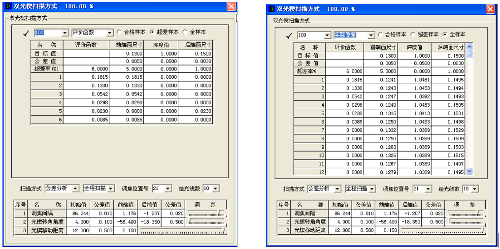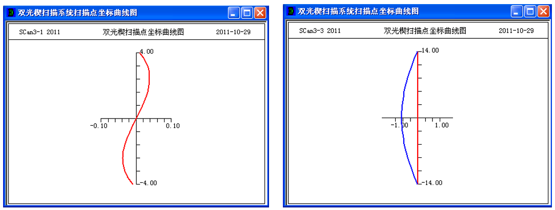 由于雙光楔三維立體深度掃描系統(tǒng)設(shè)計(jì)時(shí)變量因素較多,而且各自影響又比較獨(dú)立,因此采用手工調(diào)節(jié)的方法比較直觀有效,設(shè)計(jì)時(shí)只要在如圖8填寫完有關(guān)參數(shù)之后點(diǎn)擊“確定”按鈕即可出現(xiàn)一幅新的設(shè)計(jì)畫面如圖9。利用每行數(shù)據(jù)右側(cè)滾動(dòng)條即可隨意修改相應(yīng)參數(shù)幷在上方圖形中及時(shí)動(dòng)態(tài)觀察掃描光線變化情況以確定滿足要求的設(shè)計(jì)參數(shù)值。為觀察設(shè)計(jì)效果,可以利用圖10下方所示 “掃描方式”下拉式菜單觀察設(shè)計(jì)中的各種信息,其中擴(kuò)掃描光線的各種掃描效果、掃描輪廓圖形、圖形誤差以及掃描輪廓誤差及公差分析等,如圖9、圖10、圖11及圖12所示。