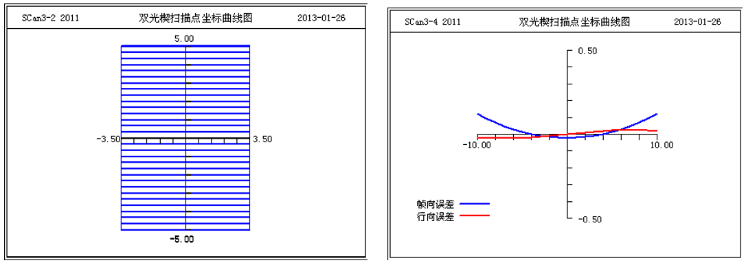 至于二維矩形掃描,也就是利用兩對(duì)雙光楔分別在子午和弧矢兩個(gè)方向上做線性掃描就可完成。在進(jìn)行自動(dòng)設(shè)計(jì)時(shí),在圖4內(nèi)選擇“平面掃描”,窗體會(huì)顯示需要分別填寫子午方向掃描(幀掃)要求及弧矢方向掃描(行掃)要求及兩個(gè)方向雙光楔的所在面序號(hào)即可。填寫具體含義同一維線性掃描內(nèi)容。數(shù)據(jù)信息填寫完畢,點(diǎn)擊“確定”按鈕,程序會(huì)立即計(jì)算出兩組雙光楔的角度設(shè)計(jì)值如圖5。圖6分別顯示了雙光楔二維物方矩形掃描系統(tǒng)子午和弧矢兩個(gè)剖面結(jié)構(gòu)示意圖,圖6顯示了系統(tǒng)物點(diǎn)掃描軌跡及像方掃描點(diǎn)誤差曲線。像方掃描點(diǎn)誤差相當(dāng)于物方掃描畸變。