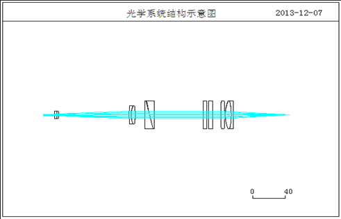 然后在此窗體內(nèi)選擇“物方掃描”或“像方掃描”,再選擇“線性掃描”。此時(shí)就可以在窗體內(nèi)填寫設(shè)計(jì)要求,比如物(像)方掃瞄視場(chǎng)(角度)、掃瞄視場(chǎng)(角度)公差要求、指定計(jì)算掃描數(shù)以及指定光楔角度單位(角度或角分),再就是要指定雙光楔在系統(tǒng)內(nèi)所在面序號(hào)。由于雙光楔有兩個(gè)光楔,每個(gè)光楔只有一個(gè)斜角面,因此在指定光楔面序號(hào)時(shí)要分別指定前后兩個(gè)斜角面的斜角面序號(hào)。當(dāng)然還可以給出光楔斜角面的斜角角度參考值及角度公差值。以上信息填寫完畢,點(diǎn)擊確定按鈕“√”程序會(huì)立即自動(dòng)計(jì)算出光楔的角度值完成設(shè)計(jì)。圖2就是這的設(shè)計(jì)滿足設(shè)計(jì)要求的系統(tǒng)結(jié)構(gòu)示意圖。圖3為雙光楔一維線性掃描系統(tǒng)像面誤差曲線圖供誤差分析參考。