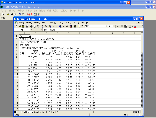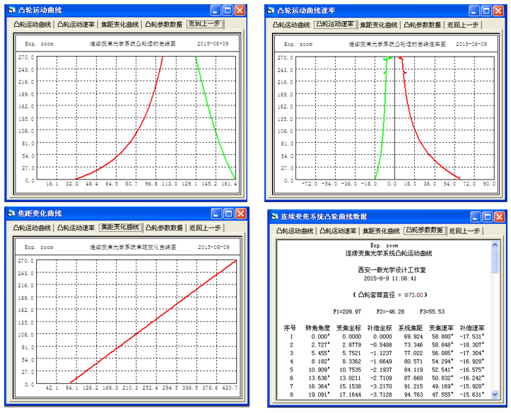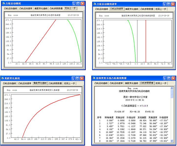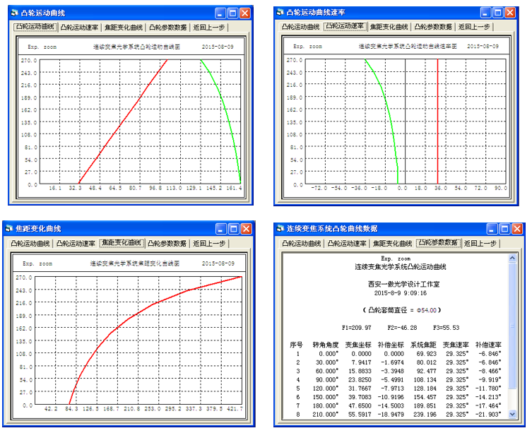 以上選擇確定或數(shù)據(jù)填寫完畢之后,只要按“確定”按鈕,便可自動完成凸輪曲線設計工作。設計結果如圖12。從圖13至圖14可以看出,通過書簽式接口可以方便地查看設計結果的凸輪運動曲線、凸輪升角曲線、焦距變化曲線以及凸輪參數(shù)數(shù)據(jù)等內容。其中凸輪運動曲線直接顯示了系統(tǒng)變焦組和補償組的運動曲線形狀,還可從圖上讀出曲線各點的坐標值;凸輪升角曲線是根據(jù)設計出的凸輪運動曲線計算出的曲線上各點的斜率只值,從中分析凸輪曲線運動陡度,陡度過大就容易造成運動的卡滯,影響使用效果;焦距變化曲線顯示了系統(tǒng)焦距隨凸輪轉動的變化關系,因為有些對系統(tǒng)焦距變化要求嚴格控制幷需要便于讀取的系統(tǒng),就必須在凸輪設計時控制焦距變化曲線。為了給出凸輪運動曲線的具體數(shù)據(jù),選擇凸輪參數(shù)資料書簽,便可以直接讀出所有設計資料如圖15。對給出的數(shù)據(jù)可以直接在接口上進行進一步文字編輯、保存和打印。