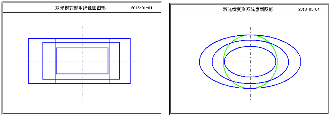 雙光楔變形系統(tǒng)可以作為非對稱擴束或圖形變形的雙光楔附加系統(tǒng)。該系統(tǒng)利用雙光楔消色差及兩組膠合光楔的不同傾斜角度,可以改變系統(tǒng)視場角度,再加上光楔子午及弧矢兩個不同方向的主要使系統(tǒng)在兩個不同方向上放大倍率不同可以構(gòu)成使像面變寬或變窄的變形系統(tǒng)。雙光楔變形系統(tǒng)被廣泛應(yīng)用于寬銀幕電影(視頻)的拍攝及放映方面極其方便有效。圖1顯示了變形系統(tǒng)在兩個不同方向的光學(xué)示意圖。圖2顯示了變形系統(tǒng)變形圖像示意圖。左側(cè)為矩形圖像變形,右側(cè)是圓形圖像變形效果圖。圖中紅色圖形為變形前物方原形,藍(lán)色為變形后像方效果。