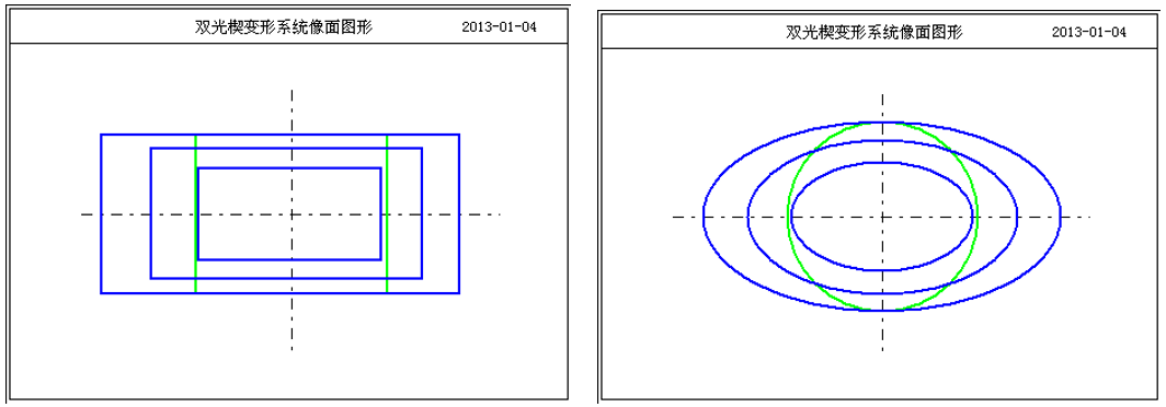 雙光楔變形系統(tǒng)可以作為非對(duì)稱擴(kuò)束或圖形變形的雙光楔附加系統(tǒng)。該系統(tǒng)利用雙光楔消色差及兩組膠合光楔的不同傾斜角度,可以改變系統(tǒng)視場(chǎng)角度,再加上光楔子午及弧矢兩個(gè)不同方向的主要使系統(tǒng)在兩個(gè)不同方向上放大倍率不同可以構(gòu)成使像面變寬或變窄的變形系統(tǒng)。雙光楔變形系統(tǒng)被廣泛應(yīng)用于寬銀幕電影(視頻)的拍攝及放映方面極其方便有效。圖1顯示了變形系統(tǒng)在兩個(gè)不同方向的光學(xué)示意圖。圖2顯示了變形系統(tǒng)變形圖像示意圖。左側(cè)為矩形圖像變形,右側(cè)是圓形圖像變形效果圖。圖中紅色圖形為變形前物方原形,藍(lán)色為變形后像方效果。