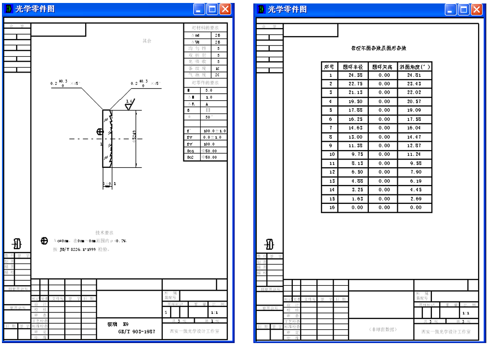 對(duì)帶有菲涅爾面型的光學(xué)系統(tǒng)(菲涅爾透鏡)設(shè)計(jì)完成之后,OCAD 可以像其他非球面鏡一樣繪制各種光學(xué)圖紙。在繪制零件圖是還可以繪出菲涅爾面的所有面型參數(shù),如圖5所示。