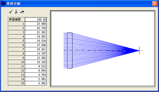 菲涅爾透鏡是一種利用多層環(huán)形圓錐表面構(gòu)成的特殊面型結(jié)構(gòu),用以使光線按預(yù)定會(huì)聚角會(huì)聚的光學(xué)元件,他等效于一個(gè)球面透鏡,如圖2所示。菲涅爾透鏡多用于要求結(jié)構(gòu)簡(jiǎn)單的大孔徑非成像系統(tǒng),特別是照明系統(tǒng)更為常見(jiàn)。這類系統(tǒng)往往只需要一個(gè)單片透鏡,工藝簡(jiǎn)單可以模壓成形。在對(duì)該類透鏡初始結(jié)構(gòu)設(shè)計(jì)時(shí)利用 OCAD 程序也非常簡(jiǎn)單。只要在數(shù)據(jù)表格中的“表面面型”欄內(nèi)選擇“菲涅爾面”,接著界面會(huì)出現(xiàn)菲涅爾面型設(shè)計(jì)窗體如圖3。在此窗體表格內(nèi)首先 利用其中“下插入”或“刪除”工具按鈕確定菲涅爾面的環(huán)形圈數(shù),再給出菲涅爾面的表面等效焦距值,進(jìn)一步按“確定”按鈕即可自動(dòng)算出該菲涅爾面的各環(huán)錐面傾斜角度值。