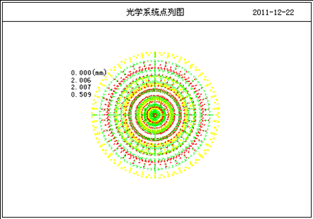 由圖3可以看出,OCAD 在對(duì)菲涅爾透鏡自動(dòng)設(shè)計(jì)時(shí)可以嚴(yán)格把各環(huán)帶中點(diǎn)的光線匯聚于一點(diǎn),但對(duì)于整個(gè)環(huán)帶菲涅爾透鏡而言,其橫向像差取決于環(huán)帶寬度,因?yàn)榫兔總(gè)環(huán)帶而言只是個(gè)平面光錐,只使光線轉(zhuǎn)折不能會(huì)聚也不能消色差。菲涅爾透鏡的光斑點(diǎn)列圖如圖4。