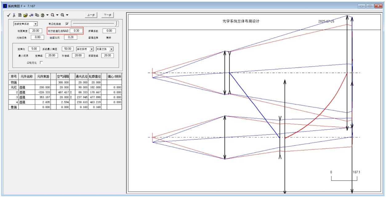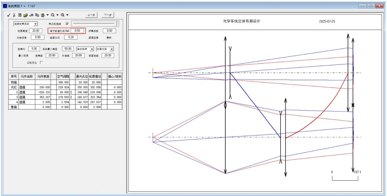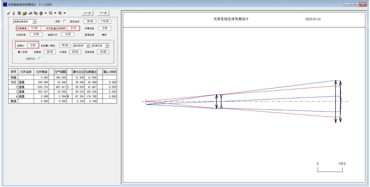 然后發(fā)現(xiàn)界面上顯示的不是系統(tǒng)焦距值,而是初始放大率值以及變倍比、物面高度、像面高度、物方數(shù)值孔徑NA0、像方數(shù)值孔徑NA0以及系統(tǒng)最小焦距等內(nèi)容。