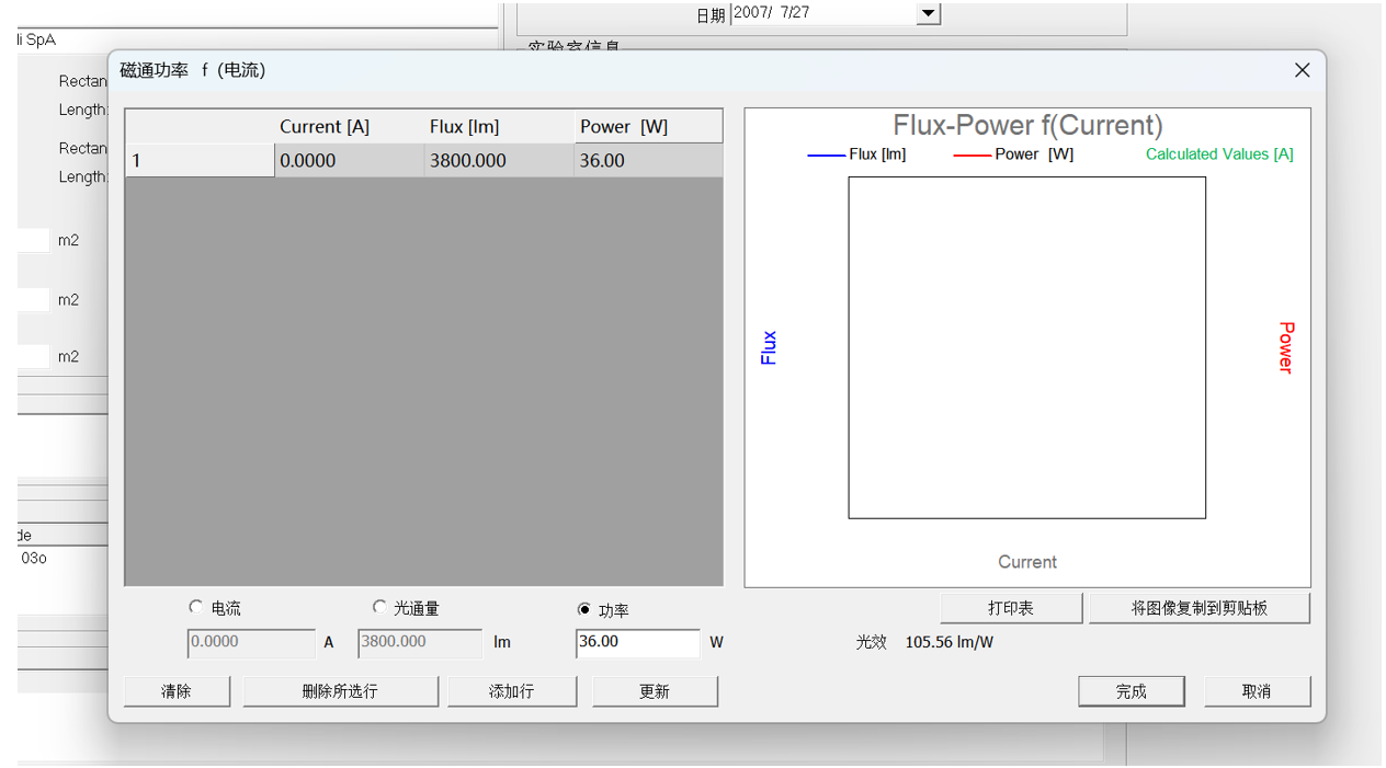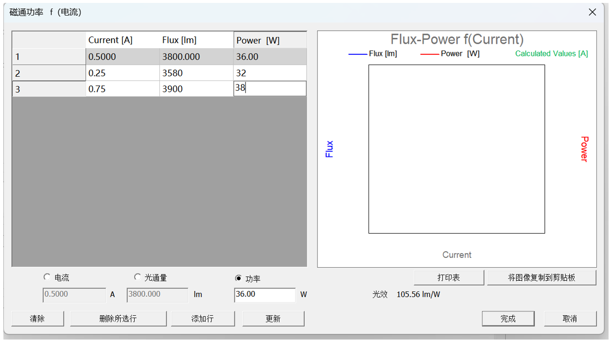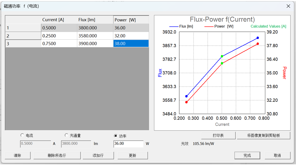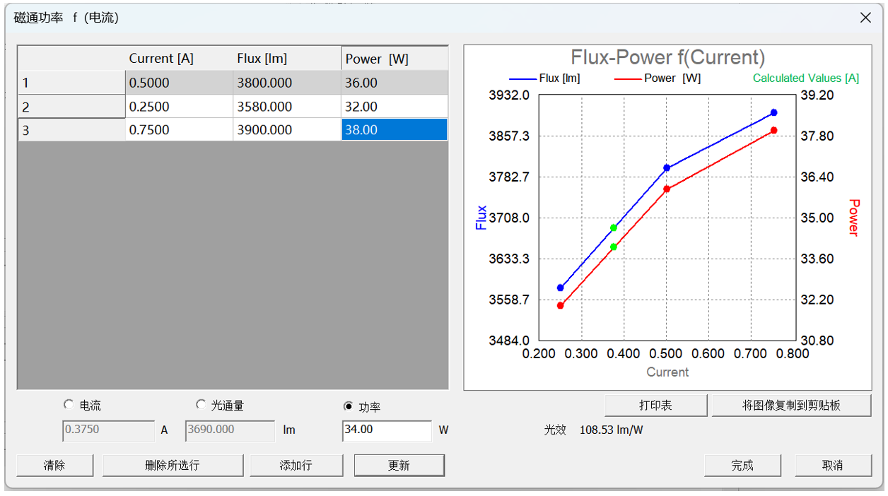將功率改為34W后,點(diǎn)擊更新,可以查看在此條件下的光通量和電流,點(diǎn)擊完成,保存為OXL文件(保存其它文件格式時(shí),只能保留一組數(shù)據(jù)),保存后,再次導(dǎo)入時(shí)可以看到完整的數(shù)據(jù)