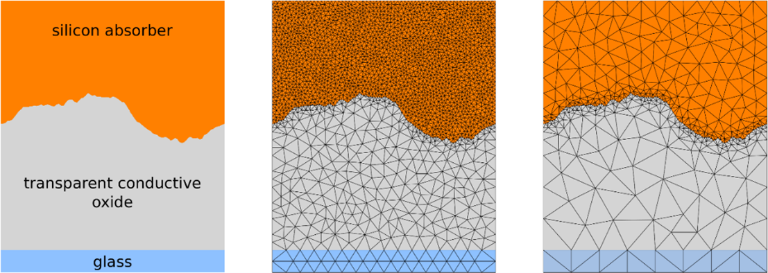 薄膜硅太陽能電池依靠散射結(jié)構(gòu)將入射光衍射到更大的角度,從而在高折射率吸收材料中通過全內(nèi)反射捕獲光。它們的優(yōu)化是當(dāng)前研究的一個課題。一般來說,即使散射結(jié)構(gòu)在本質(zhì)上是統(tǒng)計性質(zhì)的,也可以在JCMsuite軟件中通過應(yīng)用周期邊界條件對單元進(jìn)行建模,也可以對簡單、隨機(jī)紋理薄膜太陽能電池進(jìn)行幾何定義和網(wǎng)格劃分,進(jìn)而對不同層材料的衍射、吸收效率進(jìn)行分析。