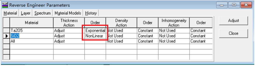 1. 反演工程現(xiàn)在包含一個(gè)厚度變化的指數(shù)模型。這可以讓初始膜層的工具因子變化,但隨著連續(xù)的沉積進(jìn)行,工具因子會(huì)接近穩(wěn)定值,初始值和參數(shù)限制,也用來控制這個(gè)指數(shù)模型。