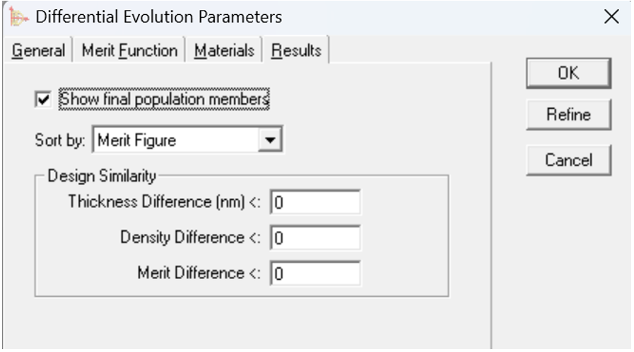 現(xiàn)在可以檢查和保存差分進化中的最終種群。Differential Evolution Parameters對話框的Result選項卡用于指定如何顯示種群。Design Similarity用于將相似的設(shè)計組合在一起,以便在最終種群中顯示的設(shè)計數(shù)量可以保持在合理的數(shù)量。