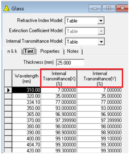 材質(zhì)定義現(xiàn)在可以為X和Y軸提供單獨的內(nèi)部透射率定義。當(dāng)存在內(nèi)部透射率定義時,X軸和Z軸的折射率必須相同。