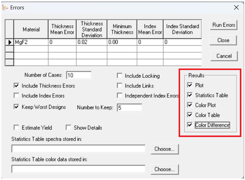 Errors工具現(xiàn)在計算一次運行中所有類型結(jié)果的錯誤。在運行工具之前,在Errors對話框中選擇所需的結(jié)果。這意味著所有的結(jié)果都是由同一組隨機設(shè)計產(chǎn)生的。