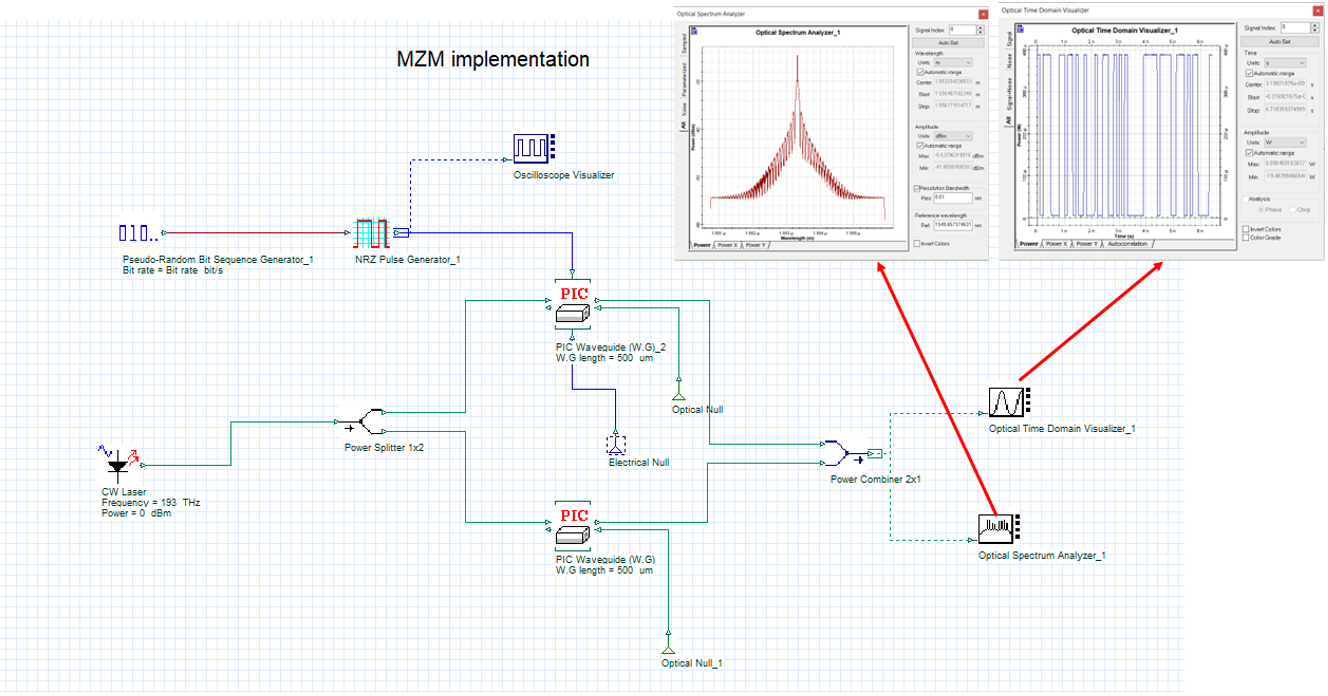 圖2展示了采用兩個(gè)光子集成電路波導(dǎo)(W.G)組件實(shí)現(xiàn)的馬赫-曾德爾調(diào)制器(MZM)進(jìn)行外部調(diào)制的10Gbps調(diào)制信號(hào)原理圖。