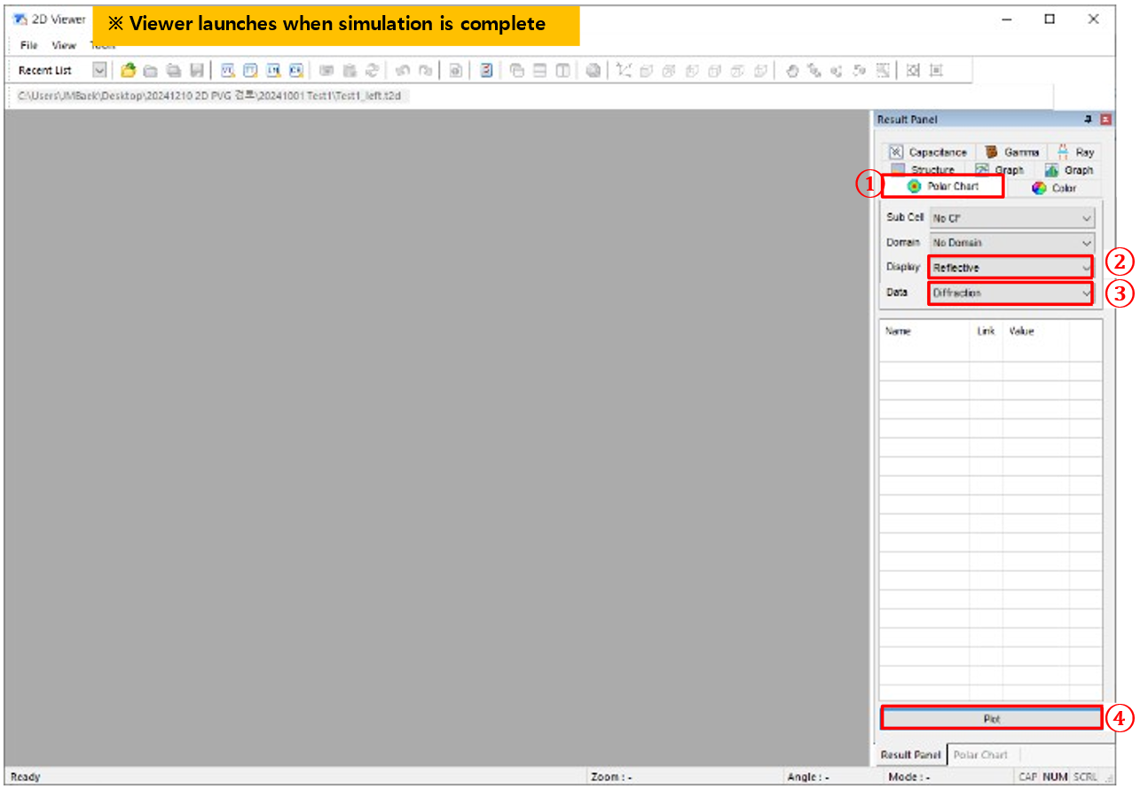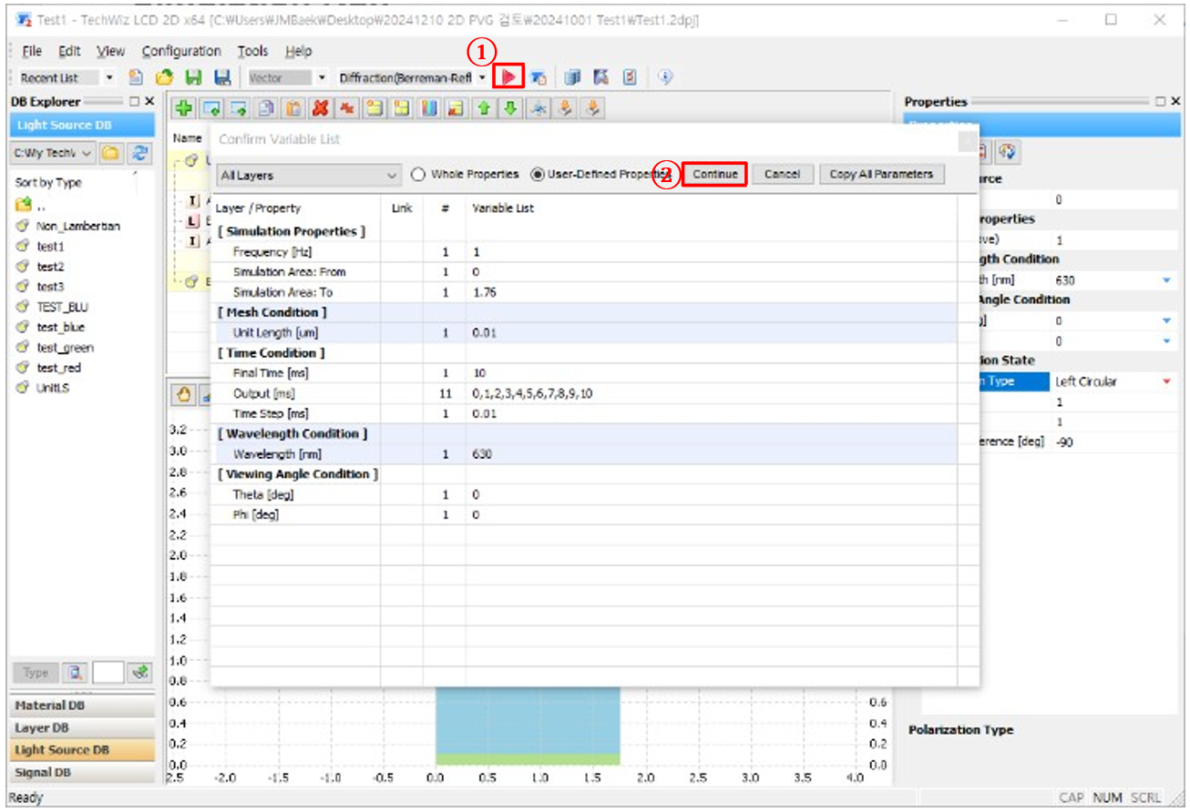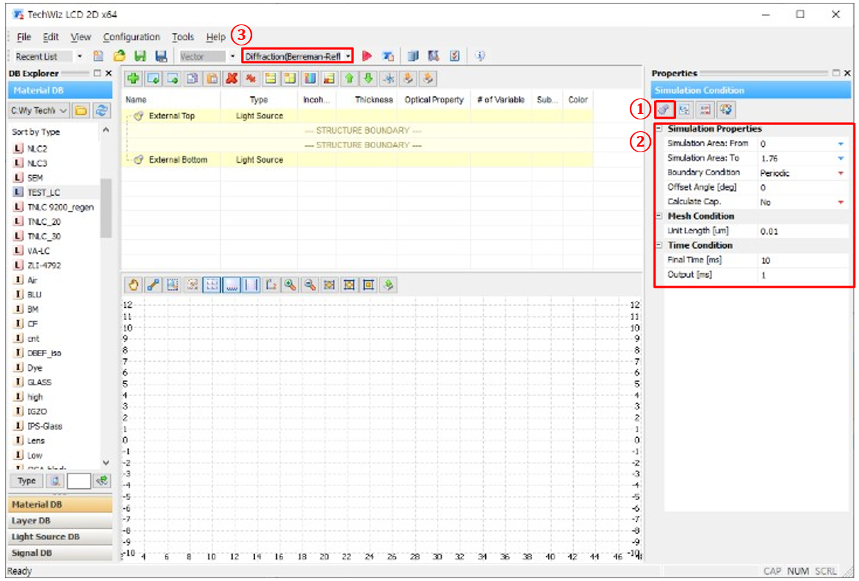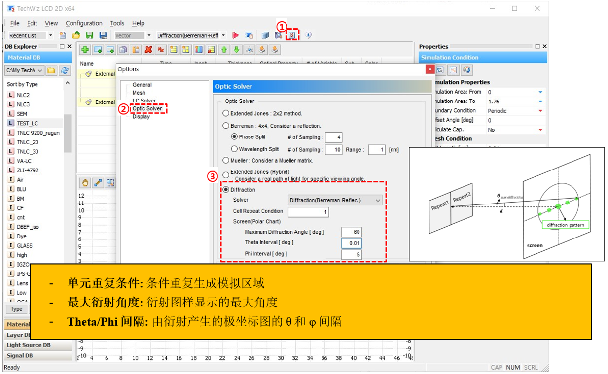 a) ① 仿真條件→  ② 設(shè)置仿真屬性 →  ③ 選擇光學(xué)求解器 (Diffraction(Berreman Reflec.))