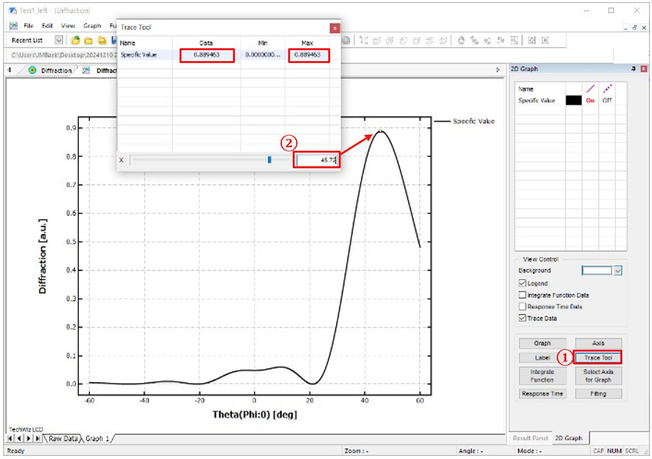 i) ①選擇跟蹤工具→ ②設(shè)置Theta值(衍射角:45.72˚(數(shù)據(jù)最大值點(diǎn)))