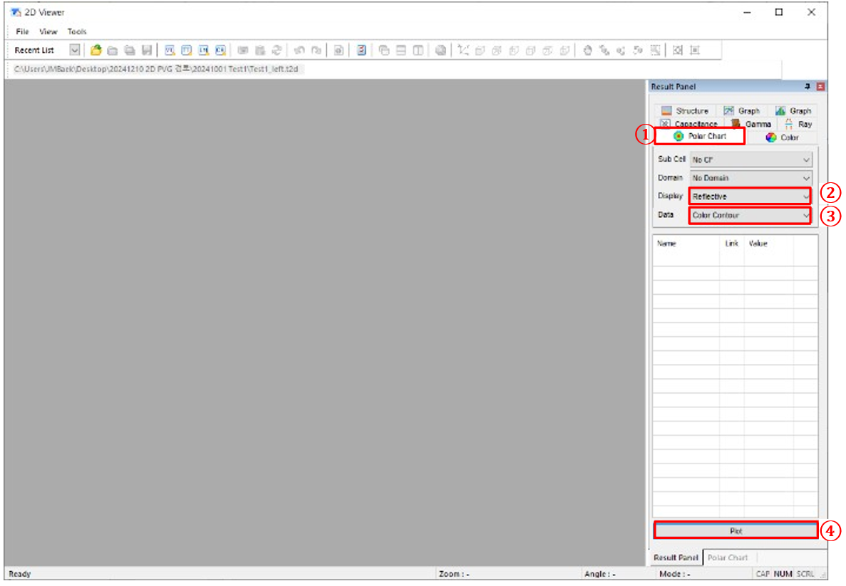 j) ①極坐標(biāo)圖→ ②選擇顯示(反射)→ ③ 選擇數(shù)據(jù)(色彩輪廓)→④ 繪制