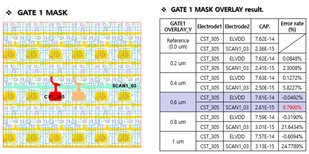 可以將結(jié)構(gòu)參數(shù)設(shè)置為變量,執(zhí)行高級(jí)工藝余量分析,如圖顯示了根據(jù)柵極掩膜的覆蓋率的電容結(jié)果,通過(guò)使用split選項(xiàng),工程師可以通過(guò)門(mén)極掩膜的未對(duì)準(zhǔn)來(lái)預(yù)測(cè)錯(cuò)誤率。