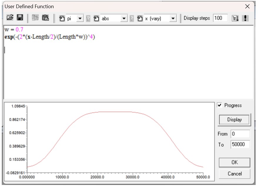 在這一步中,您將學(xué)習(xí)如何在“User Defined”對話框中編寫函數(shù)。“User Defined”對話框允許您使用基本語法對函數(shù)進(jìn)行編程,并通過按下“顯示”按鈕對函數(shù)進(jìn)行可視化測試。在此步驟結(jié)束后,您將完成定義光纖布拉格光柵的所有必要參數(shù)。